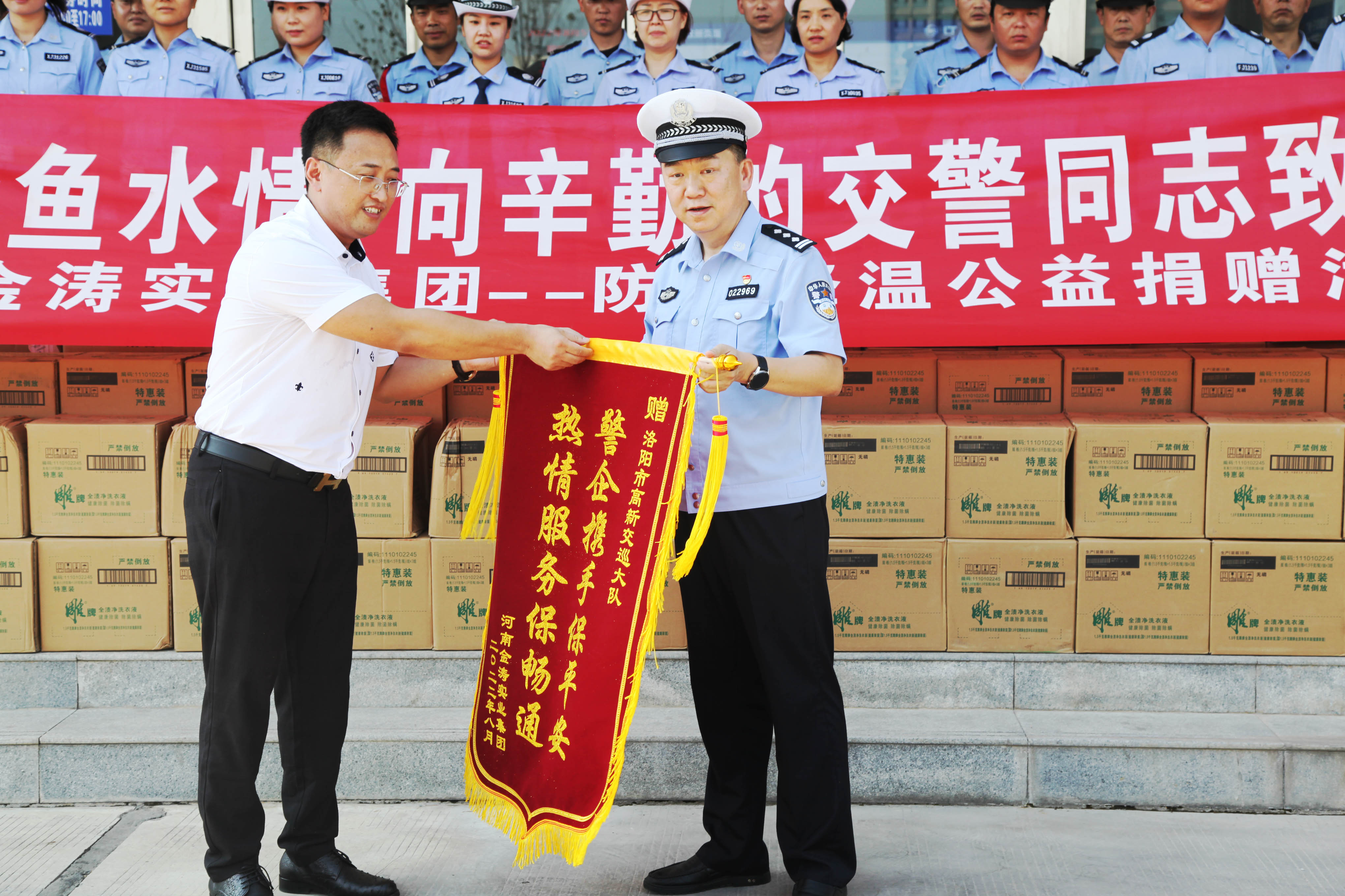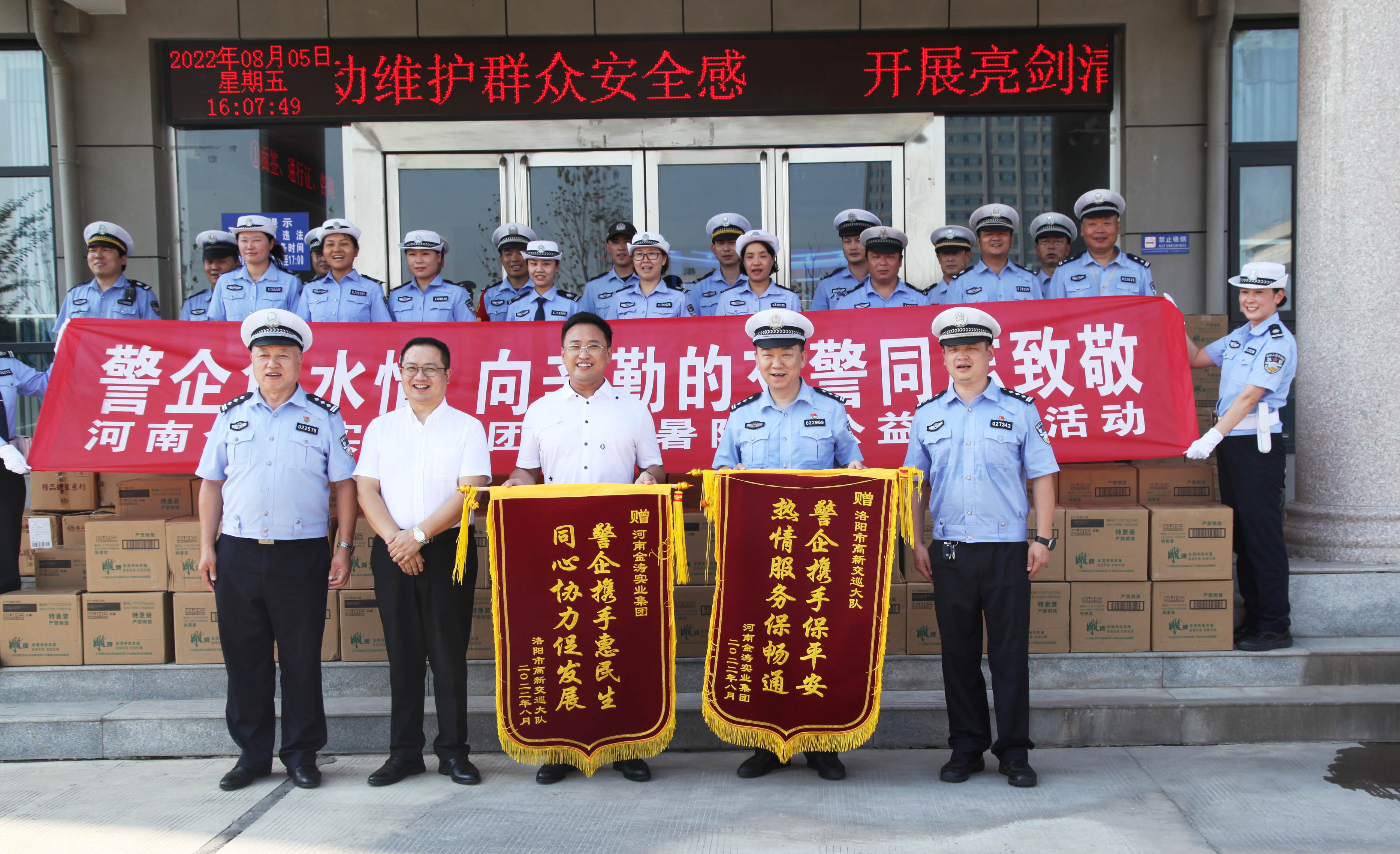 2022年8月5日,金濤實(shí)業(yè)集團(tuán)一行在董事長(zhǎng)李登科的帶領(lǐng)下,到高新區(qū)慰問(wèn)一線交警,并為堅(jiān)守崗位的洛陽(yáng)市高新交巡大隊(duì)捐贈(zèng)了一批防暑降溫物資。高新交巡大隊(duì)表達(dá)了感謝,并為金濤實(shí)業(yè)集團(tuán)授予了“警企攜手惠民生、同心協(xié)力促發(fā)展”的錦旗。