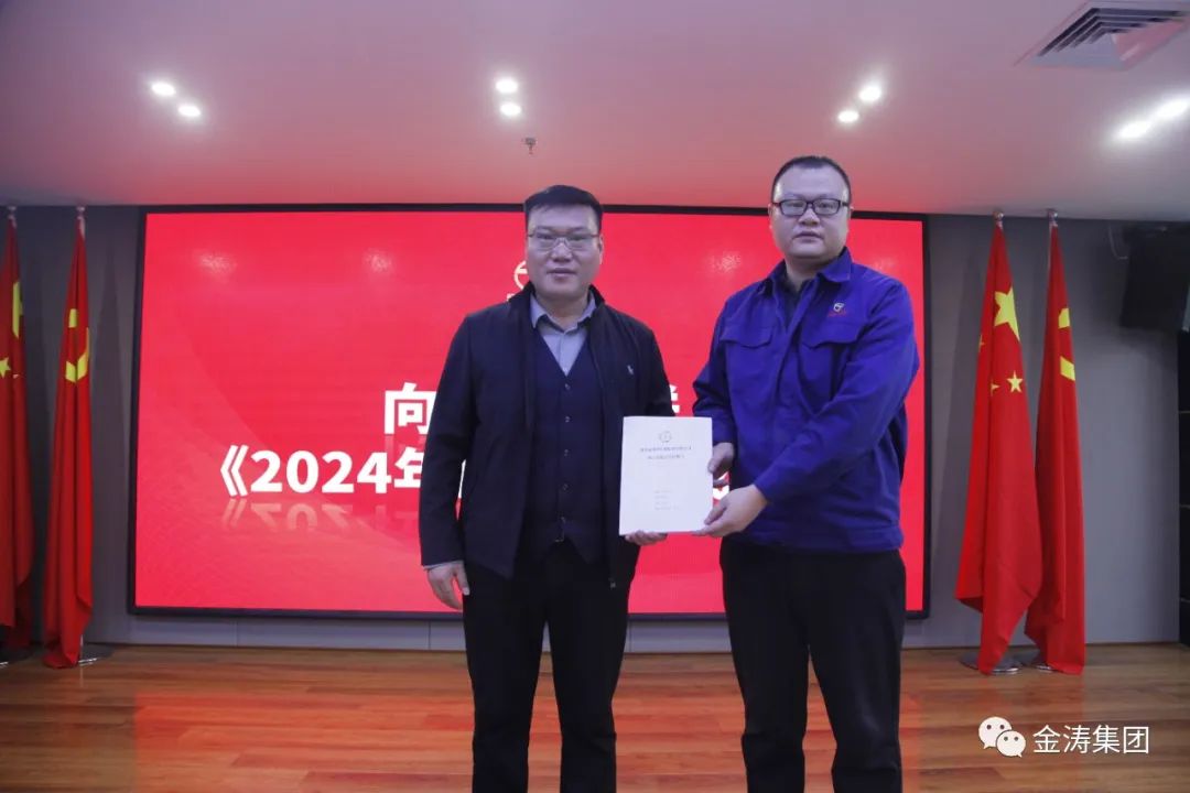 集團(tuán)總經(jīng)理王志軍對(duì)2023年工作進(jìn)行了總結(jié),針對(duì)2024年度經(jīng)營(yíng)任務(wù)做了分解,對(duì)工作框架進(jìn)行了詳實(shí)的鋪排部署。各部門(mén)負(fù)責(zé)人簽署了軍令狀并向公司誓師,誓師完成后集團(tuán)總經(jīng)理助理李正曉、子公司總經(jīng)理崔文賓、孫宏分別向董事長(zhǎng)劉強(qiáng)濤和總經(jīng)理王志軍呈送年度經(jīng)營(yíng)計(jì)劃書(shū)。